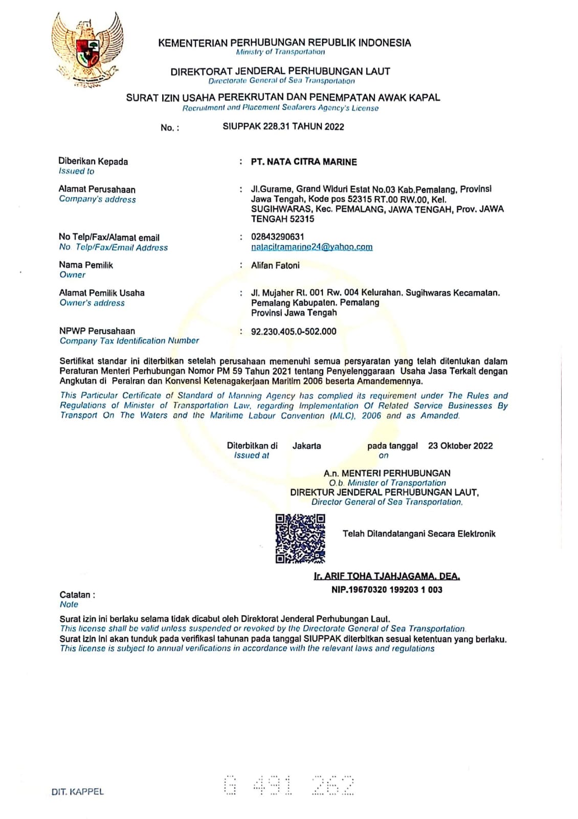 Founded in 2019, PT. Nata Citra Marine is a Crew Agency based in Pemalang, Central Java, Indonesia.